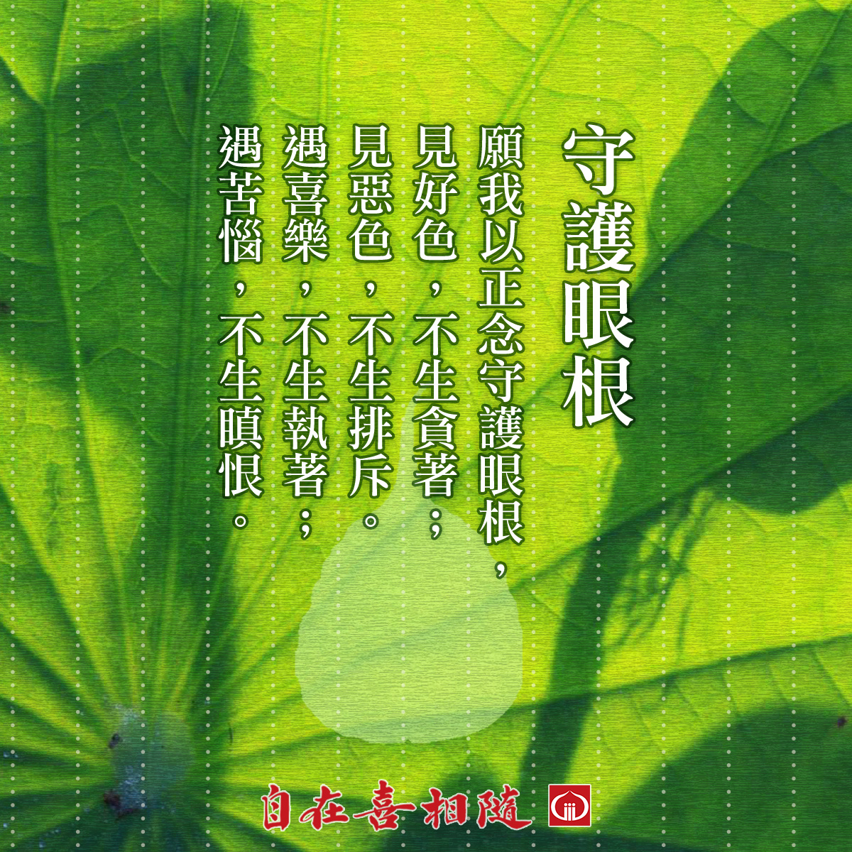 守護眼根 發表於 2026 年 01 月 18 日 由 香光 回覆 願我以正念守護眼根, 見好色,不生貪著;見惡色,不生排斥。 遇喜樂,不生執著;遇苦惱,不生瞋恨。 自在喜相隨 線上閱讀:https://gaya.org.tw/easy