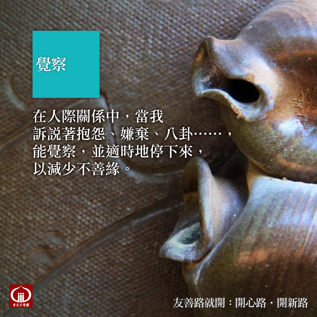 覺察 發表於 2026 年 03 月 27 日 由 香光 回覆 在人際關係中, 當我訴說著抱怨、嫌棄、八卦……, 能覺察,並適時地停下來, 以減少不善緣。 友善路就開 線上閱讀:https://gaya.org.tw/friendly