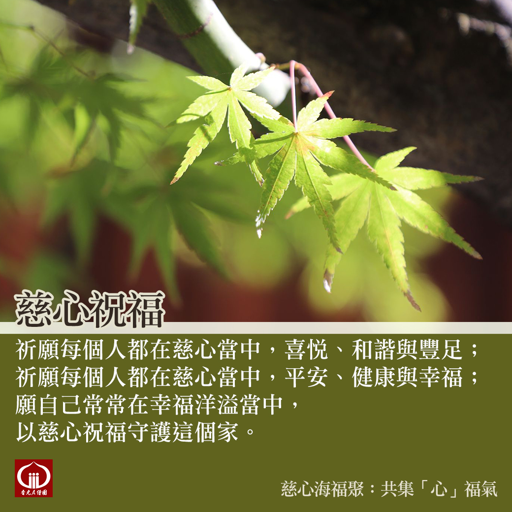 慈心祝福 發表於 2025 年 10 月 03 日 由 香光 祈願每個人都在慈心當中, 喜悅、和諧與豐足; 祈願每個人都在慈心當中, 平安、健康與幸福; 願自己常常在幸福洋溢當中, 以慈心祝福守護這個家。 慈心海福聚 線上閱讀:https://gaya.org.tw/metta