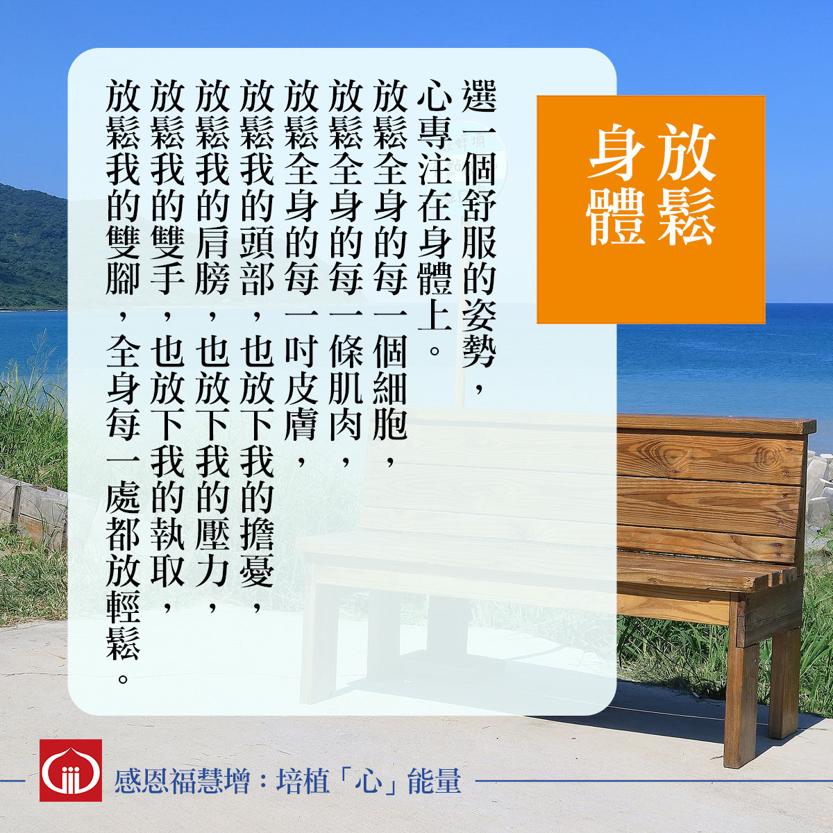放鬆身體 發表於 2025 年 11 月 21 日 由 香光 選一個舒服的姿勢, 心專注在身體上。 放鬆全身的每一個細胞, 放鬆全身的每一條肌肉, 放鬆全身的每一吋皮膚, 放鬆我的頭部,也放下我的擔憂, 放鬆我的肩膀,也放下我的壓力, 放鬆我的雙手,也放下我的執取, 放鬆我的雙腳,全身每一處都放輕鬆。 感恩福慧增 線上閱讀:https://gaya.org.tw/thanks