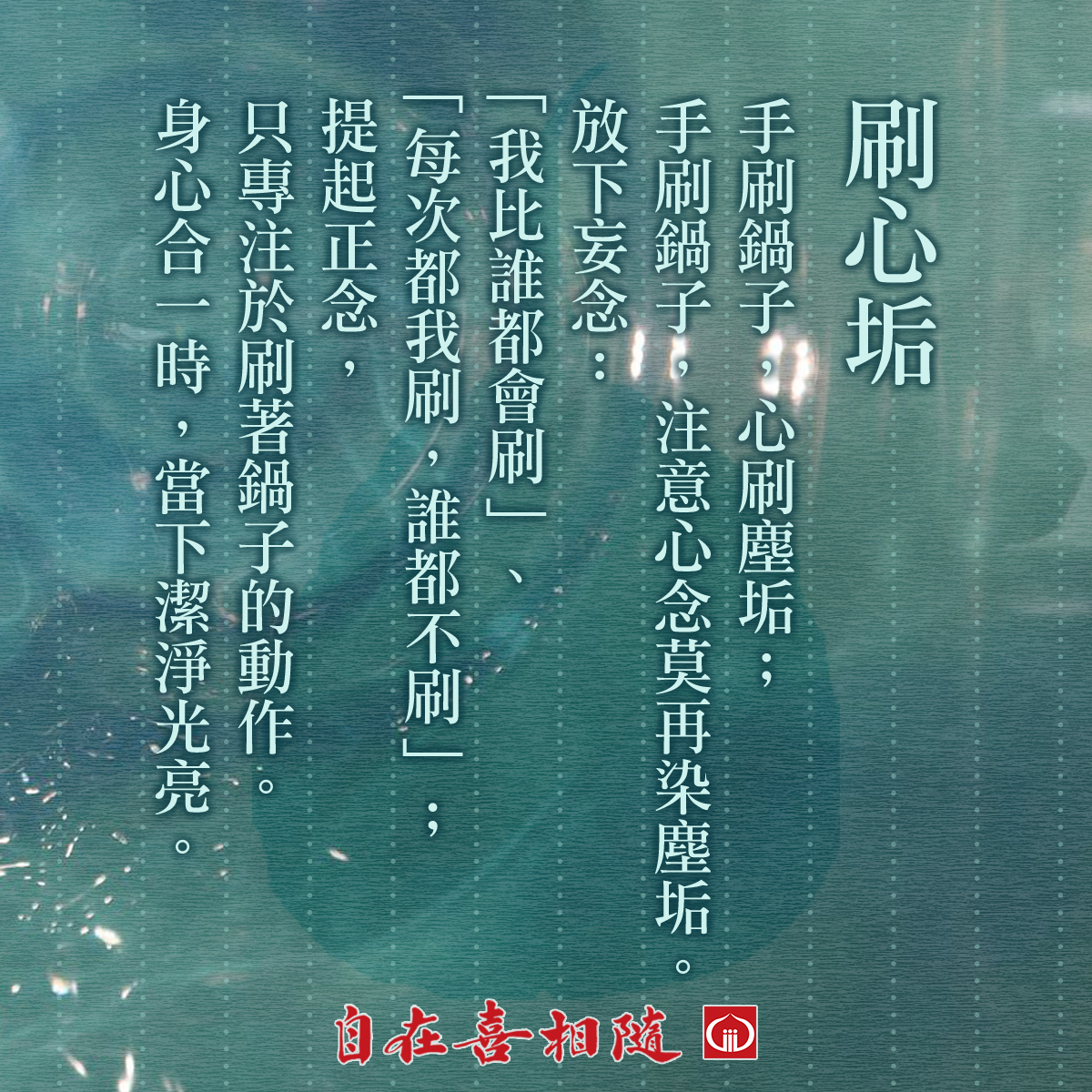 刷心垢 發表於 2025 年 11 月 23 日 由 香光 手刷鍋子,心刷塵垢; 手刷鍋子,注意心念莫再染塵垢。 放下妄念: 「我比誰都會刷」、「每次都我刷,誰都不刷」; 提起正念,只專注於刷著鍋子的動作。 身心合一時,當下潔淨光亮。 自在喜相隨 線上閱讀:https://gaya.org.tw/easy