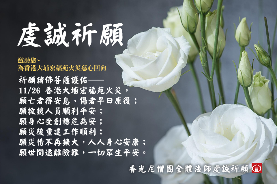虔誠祈願 發表於 2025 年 11 月 28 日 由 香光 邀請您~為香港大埔宏福苑火災慈心回向─ 祈願諸佛菩薩護佑—— 11/26 香港大埔宏福苑火災, 願亡者得安息、傷者早日康復; 願救援人員順利平安; 願身心受創轉危為安; 願災後重建工作順利; 願災情不再擴大,人人身心安康; 願世間遠離險難,一切眾生平安。 香光尼僧團全體法師虔誠祈願