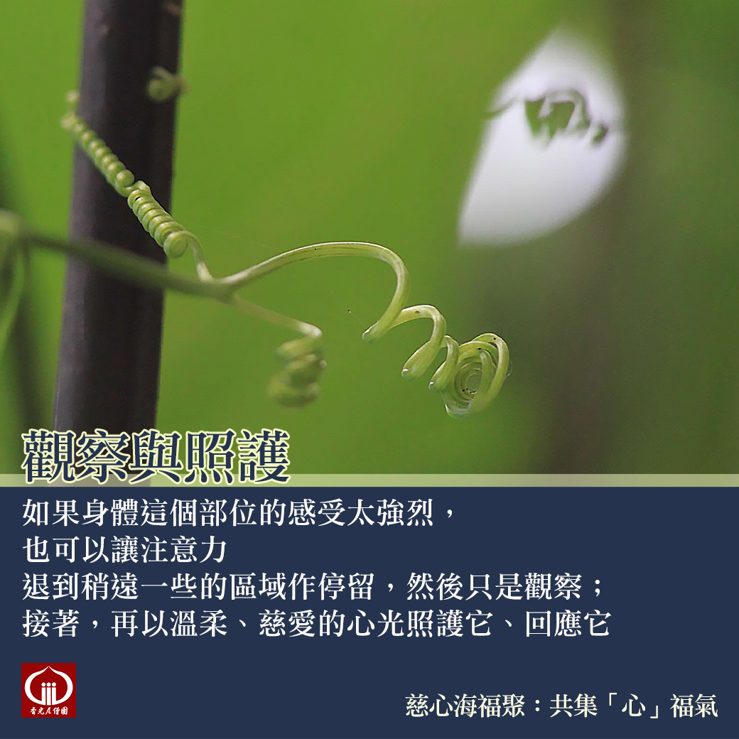 觀察與照護 發表於 2025 年 12 月 12 日 由 香光 如果身體這個部位的感受太強烈, 也可以讓注意力退到稍遠一些的區域作停留,然後只是觀察; 接著,再以溫柔、慈愛的心光照護它、回應它。 慈心海福聚 線上閱讀:https://gaya.org.tw/metta