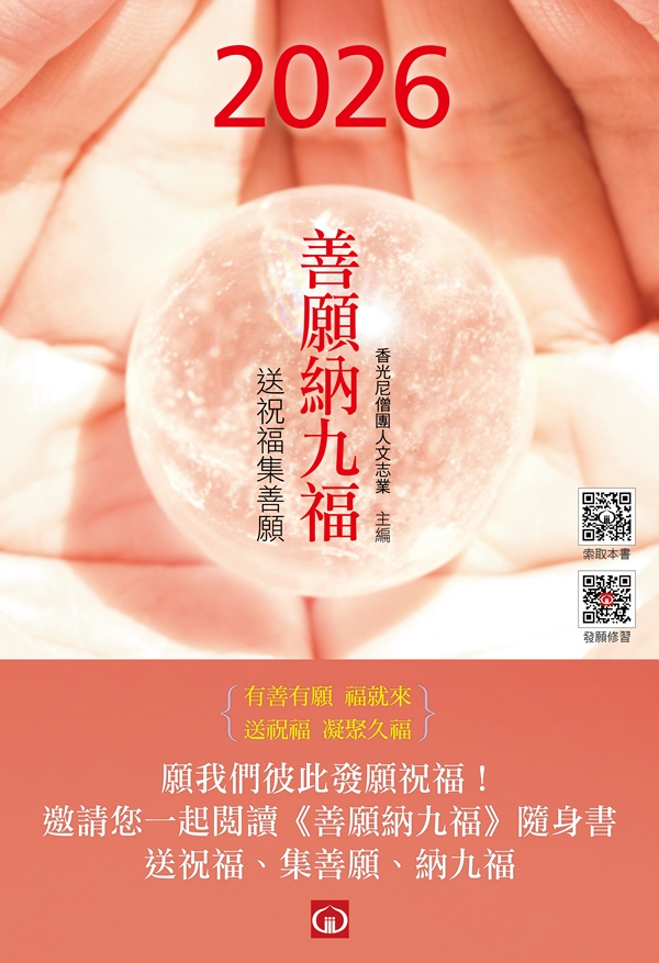 香光尼僧團祝福大家「善願納九福」。悟因長老尼勉勵我們:「有善的願,福就來。」善願,是福報的源頭,發善願可以匯聚成久福。願我們彼此發願祝福! 歡迎至香光尼僧團各分院請領實體書或網路閱讀電子書。 |