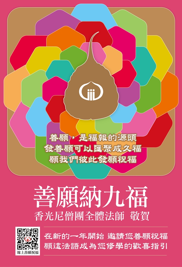 115年香光尼僧團年度祝福語為「善願納九福」。悟因長老尼勉勵我們:「有善的願,福就來。」 ※若您不方便前至實體道場,僧團也推出線上祈願卡,歡迎利用 |