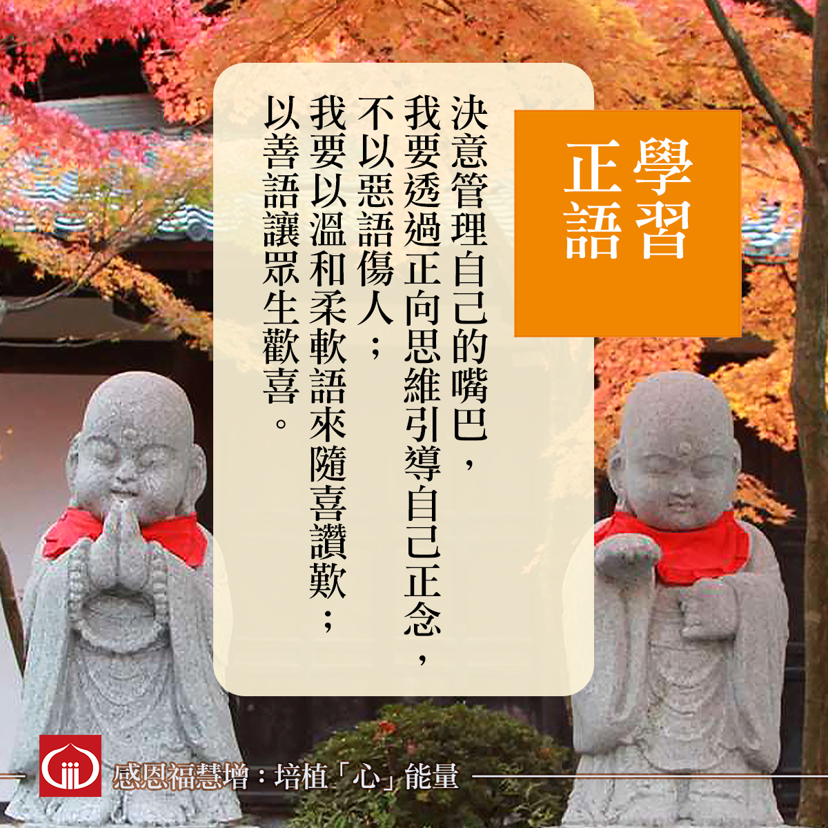 學習正語 發表於 2026 年 01 月 30 日 由 香光 決意管理自己的嘴巴, 我要透過正向思維引導自己正念, 不以惡語傷人; 我要以溫和柔軟語來隨喜讚歎; 以善語讓眾生歡喜。 感恩福慧增 線上閱讀:https://gaya.org.tw/thanks