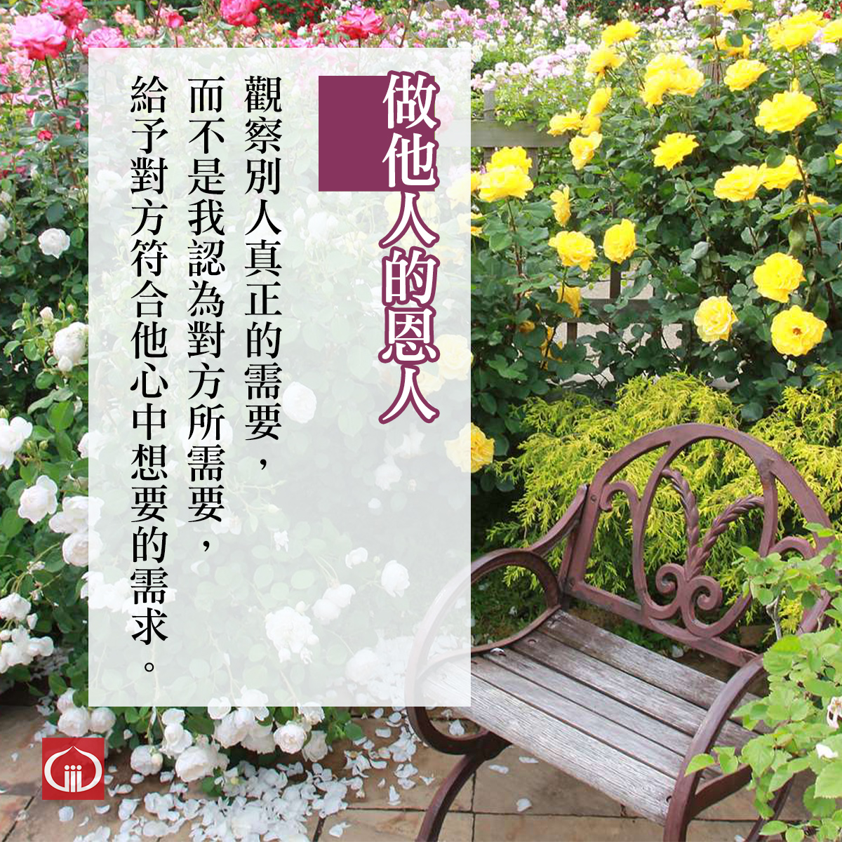做他人的恩人 發表於 2026 年 03 月 20 日 由 香光 觀察別人真正的需要, 而不是我認為對方所需要, 給予對方符合他心中想要的需求。 美心最吉祥 線上閱讀:https://www.gaya.org.tw/heart/