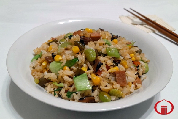 - 炒鍋熱油,先放入香菇炒出香氣後再加入素火腿同樣拌炒出香氣,放入毛豆、紅蘿蔔、玉米粒、各種調味料翻炒至熟。