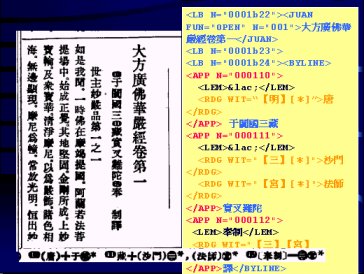 ¡@¡@¦pCBETA¶i¦æ¤jÂøg¼Æ¦ì¤Æ®Éªº¼Ð°O³B²z¡A¥Hºû²ß¦w³Õ¤hªº³ø§i¬°¨Ò¡C¹ï©ó¤jÂøg¥»¤å¡A¥ý°µ¤@Ó¥b¦Û°Ê¤Æªº¼Ð°O³B²z¡A¥[¤W¤@¨Ç¼ÐÅÒ¡]tag¡^¡FµM«á¦A¤À¼h³B²z¡m¤j¥¿Âánªº¸}µù¡]footnotes¡^¡CÁ|¨Ò¡A¡mµØÄY¸g¡n¦³¸g¦W¡BĶªÌ¡A°µ¼Ð°O¤å¦r®É¡A²Ä¤@Ó¼h¦¸§e²{¦p¹Ï©Ò¥Ü: