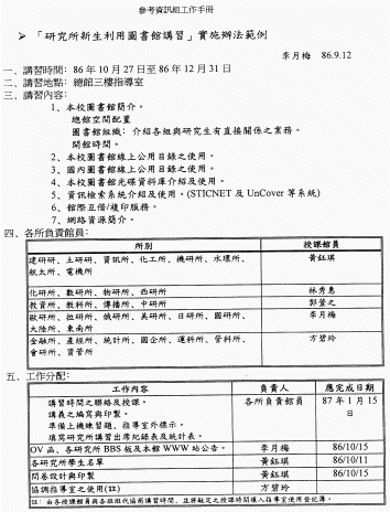 「蒐集資料的方法」手冊,在第一版時是以一個Team Work方式進行編輯,也就是由各學院負責人提供範例,然後由一個人負責編輯,再由參考組的所有同仁看過。第二版仍依循此方式進行,但第三版時覺得這樣的編輯方式耗費很多時間,所以就改為只有主位、輔位、組長審核。