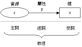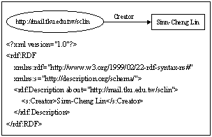 ¡@¡@ºô¸ô¸ê·½Y¯à¦³®Ä¾ã¦X¡A±N«Øºc¥X¤HÃþ¦³¥v¥H¨Ó³Ì¤jªºª¾ÃÑ®w¡]Knowledge Base¡^¡A»²§U¤HÃþ¶i¦æ±À²z»P¨Mµ¦¡CµM¦Ó¡A¦p¤µ Web ¸ê®ÆÂø¶Ã¡B¸ê°T¥ÆÀÝ¡AYnɧU¾÷¾¹¤§¥\¡A§¹¦¨¥þ¦Û°Ê¤Æªº¸ê·½¾ã¦X»Pª¾ÃѵѨú¡A¥H¥Ø«e¤§¸ê°T¬ì§Þ¦Ó¨¥¡A¹ê¤´¦³³\¦h§xÃø¡FYn§¹¥þ§Q¥Î¤H¤u¤è¦¡¡A¹ïÃe¤jªº¸ê®Æ¶i¦æ²Õ´»P¾ã²z¡A¤S¤O¦³¥¼¶e¡C¦]¦¹¡A¦b¼¶¼g Web ¤å¥ó®É¡A¥Ñ§@ªÌ©Î±M·~¤H¤hµÛ¿ýMetadata¡A´£¨Ñ¨¬°÷¾÷¾¹²z¸Ñ¤§¸ê°T¡A¹ê¬°¤@¥i¦æªº¤è®×¡A¦Ó¦¹ºØµÑ¨ú¤å¥ó¤¤Metadataªº¦æ¬°¡A¹ê»Ú¤W´N¬O¤@ºØª¾ÃÑÂ^¨úªº¹Lµ{¡A©Ò²£¥ÍªºMetadata§Y¬Oª¾ÃѪº¨ãÅéªí²{¡I¦³Å²©ó¦¹¡AW3C¤D¤j¤OҾɡu¸ê·½´yz¬[ºc¡v¡A²ºÙRDF¡]Resource Description Framework¡^¡A§@¬°³B²zMetadataªº¼Ð·Ç¼Ò¦¡¡A¨Ï±oWeb¤WªºÀ³¥Îµ{¦¡¥i¾Ú¥H¥æ´«¡u¾÷¾¹¥i²z¸Ñªº¡v¸ê°T¡]µù 45¡^¡CY¬O±q¤H¤u´¼¼zªº¨¤«×Æ[¤§¡ARDF¹ê¥iµø¬°¤@ºØª¾ÃѪí¹F¡A¨ä¸ê®Æ¼Ò«¬¡]Data Model¡^±N¸ê·½¡]Resource¡^ªí¥Ü¦¨¯S©Ê¡]Property¡^»PÈ¡]Value¡^ªºÃö«Y¡A¬Û·í©ó¡uª«¥ó-ÄÝ©Ê-È¡v¤T¤¸ªí¥Üªk¡]Object-Attribute-Value Triples¡^¡]µù 46¡^¡A¦Ó¥Î¨Ó©w¸q¸ê·½»PÄÝ©ÊÃö«YªºRDFºõn¡]RDF Schema¡^¡]µù 47¡^¡A«hÃþ¦ü¹êÅé-Ãö«Y¹Ï¡]Entity-Relationship Diagram¡^¡]µù 48¡^¡CµM¦Ó¡ARDFªº©v¦®¨Ã¤£¦b©ó«Ø¥ß¤@Ó±M®a¨t²Î©Î¤H¤u´¼¼z¨t²Î¡A¦]¦¹¡A¦bRDF¤¤¨Ã¥¼©w¸q¥ô¦óªº±À½×¾÷¨î¡]Reasoning Mechanism¡^¡A¦Ó¶ÈɧUª¾ÃѪí¹F§Þ³N¨Ó´yzMetadata¡B«Øºcª¾ÃÑ®w¡A¨Ï±o¨t²Î¶}µoªÌ¥i¥H«Ü®e©öªº¦Û¦æ¦b¦¹ª¾ÃÑ®w¤§¤W«Ø¥ß©Ò»Ýªº±À½×¤ÞÀº¡C ¡@¡@¦b RDF ¸ê®Æ¼Ò«¬¤¤¡A©Ò¦³³Q´yzªº¨Æª«¤@«ßºÙ¬°¡u¸ê·½¡v¡]Resources¡^¡A¨CӸ귽³£¾Ö¦³¤@¨Ç¡u¯S©Ê¡v¡]Properties¡^§@¬°´yz¨ä¥~Æ[¡B¯S¼x©ÎÄݩʤ§¥Î¡C´yz¸ê·½»P¯S©Êªºªí¥Ü¤è¦¡«hºÙ¬°¡u±Ôz¡v¡]Statement¡^¡A¦b¤@Ó±Ôz¤¤¥]§t¤F¡u¥Dµü¡v¡]Subject¡^¡B¡uzµü¡v¡]Predicate¡^©M¡u¨üµü¡v¡]Object¡^¤T³¡¤À¡A¥iªí¥Ü¦¨¤@Ó¤T¤¸¦¡ {predicate, subject, object}¡A©Î²¼g¦¨{p, s, o}¡A¦¹¤T¤¸¦¡µ¥¦P©ó¤@Ó°_©l©óºÝÂI s ¸g¥Ñ©·½u p «ü¦VºÝÂI o ªº¦³¦V¹Ï¡]Directed Graph¡^¡A¦p¹Ï7©Ò¥Ü¡C¨ä²[¸q¬°¡u¸ê·½s¦³¤@ÓÄÝ©Ê p¡A¨äȬO o¡v©Î§ó²¼äªº»¡ªk¡G¡us ªº p ¬O o¡v¡C