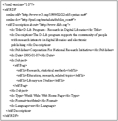 ¡@¡@¦bRDF¬[ºc¤¤µ²¦X³£¬fªL®Ö¤ß¶°¡]Dublin Core¡A²ºÙDC¡^¬O´yz Web ¤å¥ó©Îºô¸ô¸ê·½ªº¦³®Ä¤è¦¡¤§¤@¡]µù 49¡^¡C¨ä¥Îªk¦p¹Ï 11 ©Ò¥Ü¡G