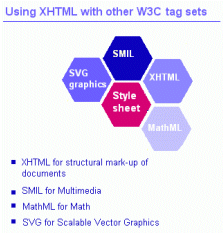 ¤G¡B¹q¤l¤å¥óªº®i¥Ü¡@¡@ XML ªº¾ã¦X©Ê¤ÎÂX¥R©Ê¡A¨Ï±o²³¦hªº XML À³¥Î»y¨¥¥i¥H¤¬¬Ûµ²¦X¡A®i²{¥X¹q¤l¤å¥óªº¦h¼Ë¤Æ·»ª¡A¦p¹Ï 12 ©Ò¥Ü¡C¥H¤U°w¹ïW3C©Ò´£¥Xªº XHTML¡BSMIL¡BMathML ©M SVG µ¥§@¬°¹q¤l¤å¥ó®i¥Ü¥Î³~ªº³W½d¥[¥H»¡©ú¡C