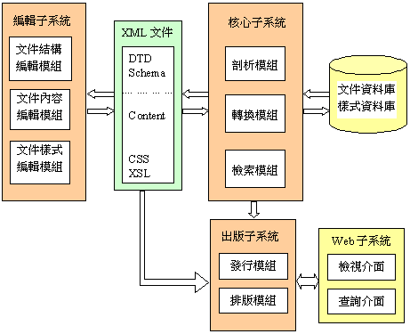 ¤@¡B½s¿è¤l¨t²Î¡]Editing Subsystem¡^¡@¡@½s¿è¤l¨t²Î§t¤TÓ¼Ò²Õ¡G¤å¥óµ²ºc½s¿è¼Ò²Õ¡B¤å¥ó¤º®e½s¿è¼Ò²Õ©M¤å¥ó¼Ë¦¡½s¿è¼Ò²Õ¡C¡]¤@¡^¤å¥óµ²ºc½s¿è¼Ò²Õ¡@¡@¤å¥óµ²ºc½s¿è¼Ò²Õªº¥Dn¥ô°È¬O´£¨Ñ¤@Ó©w¸q¤å¥óµ²ºcªº³~®|¡A³Ì¦n¨ã³Æ¹Ï§Î¤Æªº¨Ï¥ÎªÌ¤¶±¡]Graphic User Interface¡^¡A¨Ã±N¨Ï¥ÎªÌ¦bµe±¤W©Ò©w¸qªºµ²ºcÂà´«¦¨DTD©ÎXMLºõn¡A§@¬°ÅçÃÒXML¤å¥ó§¹ºc©Ê¤Î¦³®Ä©Êªº¨Ì¾Ú¡C¡]¤G¡^¤å¥ó¤º®e½s¿è¼Ò²Õ¡@¡@¦p¦P¤@¯ëªº¤å®Ñ³B²z¾¹¤@¯ë¡A¤å¥ó¤º®e½s¿è¼Ò²Õªº¥ô°È¬O´£¨Ñ¤º®e½s¿èªº¥²n¤u¨ã¡A¦p·s¼W¡B§R°£¡B½Æ»s¡B°Å¤U¡B¶K¤W......µ¥¡AY¬O¤å¥ó¤¤©|¥]§t¦h´CÅé¸ê®Æ¡A«hÁÙ»Ý¨ã³Æ¤ä´©½s¿è¦h´CÅé¸ê®Æªº¯à¤O¡C¡]¤T¡^¤å¥ó¼Ë¦¡½s¿è¼Ò²Õ¡@¡@¤å¥ó¼Ë¦¡½s¿è¼Ò²Õªº¥Dn¥ô°È¦b©ó´£¨Ñª©±©M¼Ë¦¡ªº½s±Æ¡A¦p¦r«¬¤j¤p¡B¬q¸¨¶¡¶Z¡B±Æ¦C¤è¦¡¡B¦rÅé¼Ë¦¡......¡A¤Î¦³Ãö¸Ó¤å¥ó¥~Æ[ªº³]©wµ¥¡CµM¦Ó¡A¥Ñ©óXML¤å¥ó¤£¦üHTML¦³¤º©w¼Ë¦¡¡A¥²¶·³z¹LCSS©ÎXSL¤è¦¡¨ÓÅã¥Ü¡A¦]¦¹¡A¤å¥ó¼Ë¦¡½s¿è¼Ò²Õ¥²¶·¦³¯à¤O±N¨Ï¥ÎªÌ©Ò½s±Æªº³o¨Ç¼Ë¦¡Âà´«¦¨CSS©ÎXSL¡C¤G¡B®Ö¤ß¤l¨t²Î¡]Core Subsystem¡^¡@¡@®Ö¤ß¤l¨t²Î¥Dn¦³¤TÓ¼Ò²Õ¡A¤À§O¬O¡GåªR¼Ò²Õ¡BÂà´«¼Ò²Õ©MÀ˯Á¼Ò²Õ¡C¡]¤@¡^åªR¼Ò²Õ¡@¡@«Ø¥ß¦nªºXML¤å¥ó¡A¥²¶·¥ýÀË´ú¨ä»y·N©Îµ²ºc¤W¦³µL¿ù»~¤~¯à¶i¦æº¸«áªº³B²z¡C¦]¦¹¡AåªR¼Ò²Õªº¥ô°È«K¬O¨Ì¾ÚDTD©ÎXML Schemaªº©w¸q¡AÀË´ú¤å¥óªº§¹ºc©Ê¤Î¦³®Ä©Ê¡A¨Ã±Nµo²{ªº¿ù»~§iª¾¨Ï¥ÎªÌ¡A¥H«K©ó°£¿ù¤Î×§ï¡C¥Ø«e¤w¦³³\¦h¤½¥q¥HAPI©ÎActiveX¤è¦¡´£¨Ñ²{¦¨ªºåªR¾¹¡]Parser¡^¡A¥i§@¬°µo®iåªR¼Ò²Õ¤§¥Î¡A¦pMicrosoftªºMSXML¡C¡]¤G¡^Âà´«¼Ò²Õ¡@¡@Âà´«¼Ò²Õ¥Dn¥ô°È¬O±N¤å¥óªº¸àÄÀ¸ê®Æ¡A¨Ì¾Ú©Ò©w¸qªºµ²ºcÂন¸ê®Æ®w¤è¦¡Àx¦s¡A¨äÀuÂI¬O¥iɧU²{¦³¸ê®Æ®wºÞ²z¨t²Î¡]DBMS¡^±j¤jªº¥\¯à¡A¹ï¤å¥ó¶i¦æ¬d¸ß¡B¦s¨ú¡BºÞ²z¡B¶Ç»¼µ¥³B²z¡C¡]¤T¡^À˯Á¼Ò²Õ¡@¡@À˯Á¼Ò²Õ¬O´£¨Ñ¤@Ó¤å¥óÀ˯Áªº¾÷¨î¡C¥Ñ©óÂà´«¼Ò²Õ¤w¸g±N¤å¥óÂà¦s¦¨¸ê®Æ®w®æ¦¡¡A¦]¦¹¥unÂǥѳq¥Îªº¸ê®Æ®wÀ˯Á¤è¦¡¡A¦pµ²ºc¤Æ¬d¸ß»y¨¥¡]Structure Query Language, SQL¡^¡A§Y¥i«Ü®e©öªºÀ˯Á¤å¥ó¤º®e¡C¤T¡B¥Xª©¤l¨t²Î¡]Publishing Subsystem¡^¡@¡@¥Xª©¤l¨t²Î¥Dn¦³¨âÓ¼Ò²Õ¡A¤À§O¬O¡Gµo¦æ¼Ò²Õ©M±Æª©¼Ò²Õ¡C¡]¤@¡^µo¦æ¼Ò²Õ¡@¡@¥Ñ©ó¼Æ¥H¤d¸Upªººô¸ô¨Ï¥ÎªÌ¤w¸g²ßºD©ó¨Ï¥ÎWebÂsÄý¾¹¨ÓÂsÄýºô¸ô¤å¥ó¡Aºô¶¤]¤w¦¨¤Fºô¸ô¸ê°T¶Ç¼½ªº«nºÞ¹D¡C©Ò¥Hµo¦æ¼Ò²Õªº¥Dn¥Øªº¬O±N¤å¥ó¥HWeb¤è¦¡°e¨ì¦øªA¾¹¤W¡C¡]¤G¡^±Æª©¼Ò²Õ¡@¡@¬JµMn¥HWeb¤è¦¡µo¦æ¡A±Æª©¼Ò²Õªº¥ô°È«K¬O¨Ì¾Ú¨Ï¥ÎªÌ¦b½s¿è¤l¨t²Î¤¤¡A³z¹L¤å¥ó¼Ë¦¡½s¿è¼Ò²Õ©Ò¨îqªº®æ¦¡¨Ó®i²{¤å¥ó¤º®e¡C¦Ó¬°¤F¬Û®e©Ê°ÝÃD¡AÀ³±N¨äÂà´«¬°ÂsÄý¾¹¯à±µ¨üªº±Æª©¼Ë¥»©Î¼Ð·ÇHTML¡A¥H«K¯à¶¶§Q¦a¦bWebÂsÄý¾¹¤W§e²{¡C¥|¡BWeb¤l¨t²Î¡]Web Subsystem¡^¡@¡@Web¤l¨t²ÎÄY®æ»¡°_¨Ó¡AÀ³¥i¿W¥ß©ó¡u¾ã¦X©ÊXML¤å¥óºÞ²z¨t²Î¡v¤§¥~¡A¦]¬°¥¦¬O°w¹ïŪªÌ³]pªº¡A¦Ó¤£¬Oµ¹¤å¥ó§@ªÌ¡BºÞ²zªÌ©Î¥Xª©ªÌ¨Ï¥Îªº¡C¥¦ªº¥Dn¥ô°È¬O´£¨ÑWeb¦¡ªº¨Ï¥ÎªÌ¤¶±¡AÅýŪªÌ¥i¥H³z¹L¡uÀ˵ø¤¶±¡v¨Ó¾\ۤ峹¡F³z¹L¡u¬d¸ß¤¶±¡v¨ÓÀ˯Á¤å¥ó¤º®e¡C¡@¡@ºî¤W©Òz¡A¥»¨t²Î¥R¤À¹B¥ÎXMLªº¯S©Ê¡A±N¤å¥óªºµ²ºc¡B¤º®e¡Bªí²{¤Tn¯À¤À¶}³B²z¡A°£¤F¥i¥HÅý²×ºÝ¨Ï¥ÎªÌ¶¶§Q¦aÂsÄý¨ì¤å¥ó¸ê®Æ¡A¤]¥i¥H¤è«K¹q¸£¹ï¤å¥ó¶i¦æ¬d¸ß¤ñ¹ï¡A§ó«nªº¬O¥¦¥i¥H´£¨Ñ´yz¤å¥óªºmetadata¡A¨Ò¦p¡G¤å¥ó¤ÀÃþ¡B§@ªÌ©m¦W¡B¤å¥ó¼ÐÃD¡BºKn¡BÃöÁä¦r¡B½s»s¤é´Á......µ¥¶µ¥Ø¡A³o¨Ç°T®§©Î³\¨Ã¤£¬OŪªÌ¾\Ū®Éªº«ÂI¡A¦ý¹ï©ó¾÷¾¹¦b¶i¦æ¸ê°TÀ˯Áªº¹Lµ{¡A«o¨ã¦³«¤jªº·N¸q¡A¦b¤uµ{®Ä²v¤W¥H¤Îºë½T²v¤W³£±N»·°ª©ó¹ï¥þ¤å¶i¦æÀ˯Á¡C¦¹¥~¡A¦P¤@¥÷¤å¥ó¸ê®Æ§ó¥i¥HÀH·N¥[¤u³B²z¡A¥H¦UºØ¤£¦P«¬¦¡§e²{¥X¨Ó¡A³Ð³y¦UºØ¤£¦Pªºªþ¥[»ùÈ¡C ³°¡Bµ²½×»P«ØÄ³¡@¡@XML¯à°÷¦³®Äªºªí¹Fºô¸ô¤W¦UºØª¾ÃÑ¡A¬°¸ê®Æªº¥æ´«©M³B²z´£¨Ñ·sªº¾÷¨î¡A¦]¦¹XML±N«P¨Ïºô¸ô±q¸ê°T³B²z¶¥¬q¸ó¶V¨ìª¾ÃѺ޲z¶¥¬q¡C¡@¡@±q¹q¤l¥Xª©ªº¨¤«×¨Ó¬Ý¡A¥Ø«eWeb¤W¬°¼Æ²³¦hªººô¯¸¤Î¤¬¬ÛªÈµ²ªºHTML¤å¥ó¡A¦b¼g§@¤§ªì¥Ñ©ó¯Ê¥F¦³®Äªº¸ê®ÆµÛ¿ý¡A³y¦¨¸ê®ÆÂø¶Ã¡B¤£©öÀ˯Áªº°ÝÃD¡A¦]¦¹«E»Ý¸ê°TÀ˯Á§Þ³N»P¤èªk¨Ó¸Ñ¨M¡F¦¹¥~¡A°£¤FP¤O©ó§Þ³Nªºµo®i¡A¦b¼g§@¤Î¥Xª©ªº¹Lµ{¤¤¥[±jMetadataªºµÛ¿ý¡A¥ç¤£¥¢¬°¥t¤@ӸѨMºô¸ô¤W¹q¤l¤å¥ó¶Ã¶H¨Ã´£ª@À˯Áºë½T²vªº¦³®Ä¤è®×¡CXML»P¥ÍѨӪºµ²ºc¤Æ¤Î¦Û§Ú´yz¯S©Ê¡A¯à¦³®Äªº²Õ´¸ê®Æ¡B´yz¸ê®Æ¡A¥H¶i¦æ»y·N¼h¦¸ªº¦³·N¸qÀ˯Á¡F¦Ó¨äµLÂX®iªº¯à¤O¡A§ó¨Ï¨ä¸õ²æ¬J©wªº®Ø¬[¡A¦Ó¦bª©±½s±Æ¡B¦h´CÅé¥Xª©¡B¤å¥ó¦@¨É......µ¥¤è±µo®i¥X¿W¯SªºÀ³¥Î¡A¦b¦b¨ÏXML¦¨¬°ºô¸ô¥Xª©¤º¡B¥~ÝÅUªº¦³®Ä¤è®×¡C ¡@¡@±q¸ê°T¶Ç¼½ªº¨¤«×¦Ó¨¥