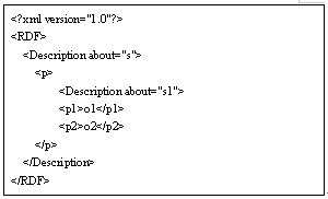 ¡@¡@¥Ñ©ó XML ¤å¥ó¨ã¦³¼Ð·Ç¤Æ¡B¶}©ñ©Ê¡Bµ²ºc¤Æ¤Î¦Û§Ú´yzµ¥¯S©Ê¡A¦]¦¹·¥¾A¦X§@¬° RDF ªº¹ê§@»y¨¥¡A¦p¹Ï9§Y¬°¹ê²{¹Ï 8 ¤§ RDF ±Ôzªº XML»yªk¡C ¡@¡@¦b RDF ¤¤¡A¬°¤F¨Ï¤å¥óŪ¼gÂù¤è³£¯àÁA¸Ñ±Ôzªº§t·N¡A¥²¶·©w¸q©¼¦¹¯à²z¸Ñªº»y·J¶°¡AºÙ¬° RDF ºõn¡]RDF Schemas¡^¡CµM¦Ó¡A¤£¦PªºRDFºõn·¥¥i¯à©w¸q¤F¦P¦Wªºµü·J¡A¥H¦Ü©ó¤@¥¹¦P®É¦b¦P¤@¥÷¤å¥ó¤¤³Q¤Þ¥Î©Î°Ñ·Ó®É¡A±N³y¦¨½Ä¬ð¡C¬°¤FÁ×§K¦¹¤@°ÝÃD¡ARDF ±Ä¥Î¤F XML ªº¦WºÙ»â°ì§@¬°¸Ñ¨M¤è®×¡A¦p¹Ï 10 ©Ò¥Ü¡C