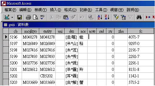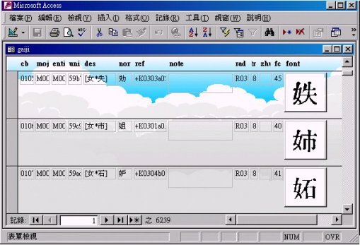 ¤G¡B¬ãµo²Õ¯Ê¦r¾ã²z ¡@¡@¬ãµo²Õ¨ú±o®Õ¹ï²Õ©Ò´£¨Ñªº¯Ê¦r¸ê®Æ«á¡A§@¥H¤U¤TÓ³¡¤Àªº³B²z¡C(1) ¥[¤JACCESS(r)®æ¦¡ªºgaiji¡]¯Ê¦r¡^¯Ê¦rªí¡A(2) ¬d¸ß¡m¤µ©õ¤å¦rÃè¡nªº¦r½X¡]MOJIKYO(r) CODE¡A²ºÙM½X¡^¡BUNICODE½X¡B³q¥Î¦r¡Bª`µ¡A¨Ãµù©ú¥X³B¡]ªì´Á¥Ñ®Õ¹ï²Õt³d¡^¡A(3) ½s©w¯Ê¦rªº³¡º¡Bµ§µe¥H¤Î¥|¨¤¸¹½X¡C ¡@¡@gaiji¯Ê¦rªí¡]¨£¹Ï¤@¡^¡A¥]¬A¡GCB½X¡]cb¡^¡BM½X¡]mojikyo¡^¡B¢ãnicode¡]uni¡^¡B²Õ¦r¦¡¡]des¡^¡B³q¥Î¦r¡]nor¡^¡Bµù°O¡]note¡^¡B³¡º¡]rad¡^¡Bµ§µe¡]str¡^¡B¦rµ¡]zhu¡^¡B¥|¨¤¸¹½X¡]fc¡^¡A¥H¤Î¯Ê¦r¹ÏÀÉ¡]¨£¹Ï¤G¡^¡C