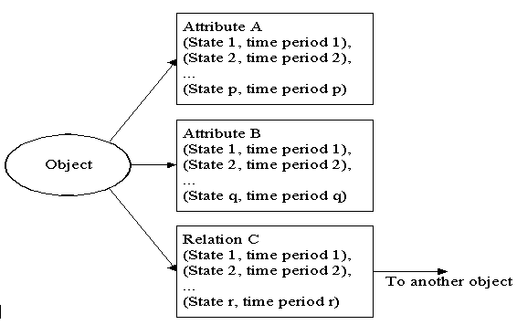 每一個物件可以有一個或多個屬性,同時也可以與其他物件構成一種或多種關係。每一個屬性及每一種關係均包含一個或多個狀態組值,用來細分同一屬性,於不同時間區段底下的屬性值,例如:描述一個人曾經擔任的官職時,則每一個官職均有明確的時間區段限制。假若一個狀態不受時間區段的限制,則所屬之時間區段為無限大,例如:描述一個人與另外一個人之間的師徒關係。