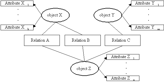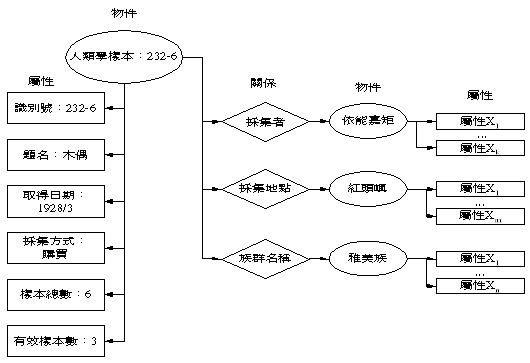 詮釋性資料除了詳細的說明每一物件的屬性之外,也具體的列出每一物件與其他物件之間的關係。表一是用來說明物件的屬性,如何使用詮釋性資料來表示 。圖三是用來表示物件之間彼此的關係,如何使用詮釋性資料來建構。也就是說,我們使用詮釋性資料來描述一物件所擁有的屬性和關係。