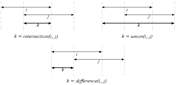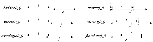 由 James F. Allen 所發展的「時間邏輯系統」理論是目前被採用於推導隱含性知識最廣泛的基礎理論(見參考書目1)。當我們在討論時間邏輯時,通常會在一段傳統的述語(predicate)上,加入一時間參數,用來形成一則具有時間涵義的新述語。舉例來說:P(a1, a2, …, ak; t)是一個含有時間的述語,其中a1, a2, … , ak為非時間性參數;t是一段與此述語有關的時間區段參數。圖五列出由 James F. Allen 所提出的時間相關性,他指出兩個時段在時間軸上,彼此間可能會發生的六種狀態。圖六則是列出三種基本的時間邏輯運算,包括有時間的交集、聯集、差集。