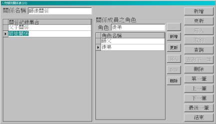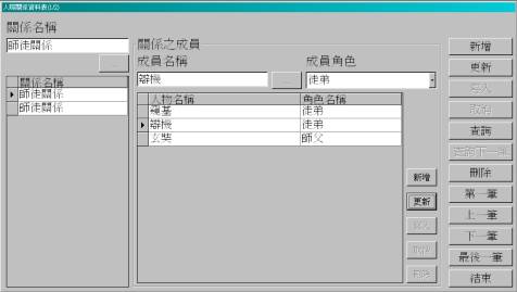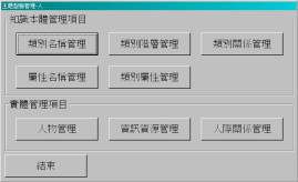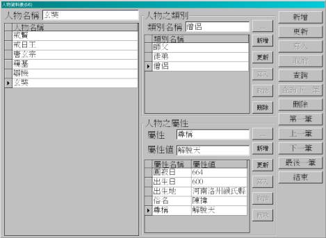 在實作過程中我們依據佛教主題地圖中,主題資料庫所記載的主題,分成人、事、時、地、物這五個子系統(圖七)。在這五個子系統中又依據上述資訊形式,分別提供個主題的本體論管理子系統(Ontology Management Subsystem)及實體管理子系統(Instance Management Subsystem)。以下說明「人」這個主題的知識庫系統雛型(圖八): (一)人物本體論管理子系統:這個子系統主要是提供管理者維護在《大唐西域記》及《大唐大慈恩寺三藏法師傳》裡,有關人物資訊的本體論。包括有:人物類別名稱、類別階層、類別關係、屬性名稱及類別屬性管理。人物類別名稱主要是用來建立《大唐西域記》裡所提到的人物類別。例如:僧侶、國王、翻譯家、師父、徒弟等。類別階層與類別關係是用來建立人物類別之間,或人物類別與其他類別之間的關聯(圖九)。例如:師徒關係是由師父與徒弟這兩個類別所構成;統治關係是由國王與國家這兩個類別所構成。屬性名稱是用來建立人物類別所具有的特徵。例如:別名、出生地、出生日、圓寂日等。類別屬性則是用來更具體的指定,不同人物類別其個別所擁有的屬性。 (二)人物實體管理子系統:這個子系統主要是提供管理者維護在《大唐西域記》及《大唐大慈恩寺三藏法師傳》裡,所記載之人物及其所屬類別與屬性(圖十)。例如:玄奘法師其類別有僧侶、徒弟、師父;屬性則有出生日(600)、圓寂日(664)、出生地(河南洛州緱氏縣)、俗名(陳褘)、尊稱(解脫天)。人物實體管理子系統亦提供實體之間關係的連結(圖十一)。例如:玄奘與窺基、辯機之間的師徒關係。此外,尚有實體之資訊資源管理。 圖七、「玄奘西域行」主題地圖管理主畫面