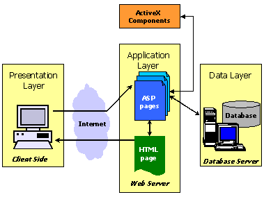 參、系統架構 一、三階層式的主從計算模型 由於全球資訊網應用程式的資料儲存及運算處理皆集中於伺服器端,基於方便管理及提高系統執行效率的考量,有必要將不同的作業與運算適當的分散至不同的電腦上執行。 三階層式的主從計算模型(3-Tier Client/Server Computing Model)是一種分散式運算架構(圖二),為目前全球資訊網應用程式最普遍採用的架構。其主要是由三個層級所構成,分別是:展示層(Presentation Layer)、應用程式層(Application Layer)及資料層(Data Layer)[20]。 (一)展示層:在典型的三層式架構中,個別用戶端的電腦上安裝了具備圖形化操作介面的程式,而這些程式可透過特定格式的表單,供使用者輸入適當的資訊,以便與伺服器進行互動。在全球資訊網應用程式架構中,展示層相當於使用者介面。其功能就是接收使用者的資料輸入,以及將伺服器傳送回的結果輸出。 (二)應用程式層:負責運算邏輯的處理程式於伺服器電腦上執行,其功能是接受來自用戶端的請求,並且決定何種資訊可以被傳送至用戶端。所以應用程式相是由許多的運算邏輯所組合而成,其目的則是用來作為使用者與資料庫之間的橋樑,負責資料處理、網站伺服器等運算法則的工作。本論文將採用Microsoft的個人網站伺服器(Personal Web Server,PWS),並採用ASP(Active Server Pages)編寫網站應用程式,再透過ADO(ActiveX Data Object)與OLE DB(Object Linked and Embedded Database)等機制與底層資料庫相連結。 (三)資料層:在資料層中,包含了儲存大量資料的資料庫,以及用來管理維護這些資料的資料庫管理系統。資料層負責提供資料給運算邏輯層,再傳送至使用者介面層,所以用戶端無法直接存取資料庫的內容,必須透過運算邏輯層的連接,因而提高了系統的安全性。三層式架構採用了主從(Client/Server)運算模式,各個階層可同時由不同的團隊以不同的程式語言及工具進行開發。由於個別階層功能的改變並不會影響到其他階層,所以非常容易在企業中進行佈署。在任何一層有必要修改或增加新的功能時,皆不致影響其他層級的正常作業。 圖二、三階層式的主從計算模型