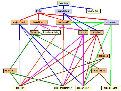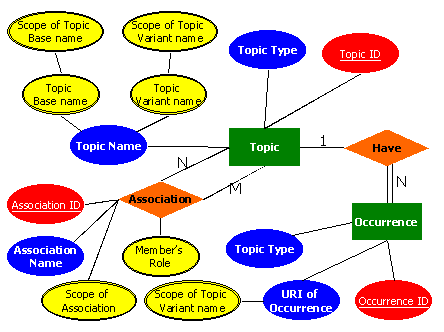 二、關聯式資料庫綱要 就像主題地圖是由許多主題組織而成的,人腦則是由許多神經細胞組織而成的。由於神經細胞是一種有機體,隨著人類的知識成長,大腦所儲存的訊息將會增加,而神經細胞的數量也會隨之增加。所以,當主題地圖所儲存的知識領域擴大時,主題的個數必定會增加。製作一個符合 ISO13250 標準規範的主題地圖,必須事先進行主題及其相關聯之定義,無法隨意更改或增加。尤其如果又是使用 XTM 的形式來記錄主題地圖,則不論是在主題的新增,或是異動等維護作業,都是相當困難的。 為此我們必須採用一種較為彈性的主題維護方式,以方便主題地圖的管理者進行知識管理。資料庫觀念的運用可說是最好的解決方式,因為資料庫是一種專門用來管理(儲存、修改、刪除、產生)企業內資料的系統。資料庫的好處之一就是「資料獨立(Data Independence)」,通俗的說,就是程式中並不包含與資料儲存格式有關的細節,當資料庫的資料結構或存取方式有任何的改變時,都不會影響到整個程式的邏輯。 我們將依據TopicMaps.Org提出的主題地圖之可擴充標示語言當中所制定的文件型態宣告(圖三),首先將它轉換成實體關係圖(圖四),再依據此實體關係圖來設計關聯式資料庫綱目,以儲存主題地圖的資訊。 圖三、主題地圖之可擴充標示語言之示意圖