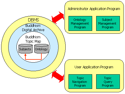肆、玄奘西域行知識庫系統雛型 整個玄奘西域行知識庫系統雛型的架構如圖六所示,可分成管理者應用程式與使用者應用程式。資料庫方面則分成本體論資料庫及主題資料庫,分別用來存放本體論層面的資料及實體層面的資料,這兩個資料庫將構成整個佛教主題地圖,整個資料庫將由資料庫管理系統所包住。 圖六、系統雛型架構