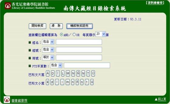 「南傳大藏經目錄檢索系統」之概介香光尼眾佛學院圖書館館長 釋自衍【摘要】:香光尼眾佛學院圖書館建置「南傳大藏經目錄檢索系統」,目的在提供不同語文版本之《南傳大藏經》目錄對照及整合查詢功能。本文擬就「南傳大藏經目錄檢索系統」之系統作業環境、資料建檔規範、檢索功能等,作一介紹。 關鍵詞:南傳大藏經;PTS版;《漢譯南傳大藏經》一、前言香光尼眾佛學院圖書館為便利讀者透過單一介面,檢索各版本藏經目錄,以利藏經的使用,故建置「藏經目錄整合查詢系統」,希望藉此系統的使用,瞭解一經在各版本藏經的收錄情況及因傳譯而產生的不同版本。(註1)但是在建置《南傳大藏經》目錄時,發現該目錄是將所收錄之各佛典結構完整呈現,與北傳藏經目錄只列出「部-經、律、論」的結構不同,而無法進行目錄整合對照之工作,因此決定獨立建置一「南傳大藏經目錄檢索系統」,以利讀者透過此系統查詢不同語文版本之《南傳大藏經》目錄。