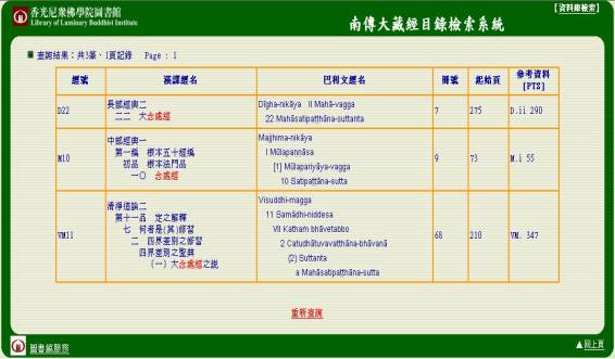 (一)收錄範圍本資料庫內容收錄巴利聖典協會(Pali Text Society,簡稱PTS)出版《南傳大藏經》,以及元亨寺出版《漢譯南傳大藏經》目錄(高雄市:元亨寺妙林,民79-87)。 (二)各資料欄位之著錄原則本資料庫共分經號、經名、冊號、頁碼等欄位。資料建檔依PTS版《南傳大藏經》及《漢譯南傳大藏經》目錄為主。資料庫以Unicode顯示巴利字型,並使用「組字法」處理電腦無法顯示的中文缺字。組字原則是依據「一般組字式的基本規則」進行。 四、檢索功能本資料庫提供「經名」、「經號」、「冊號」及「PTS本頁數」四個檢索欄位,並在系統上提供「輔助檢索說明」(http://www.gaya.org.tw/ library/palitipitaka/help.htm)。 「經名」、「經號」的部分可查詢漢譯及巴利文,例如:查詢經名《念處經》,所得結果會出現PTS版巴利文經名、冊號;漢譯版的冊號、起始頁。(詳見圖二)「冊號」則提供漢譯版冊次的查詢。此外,「經名」、「經號」、「PTS本頁數」三個欄位提供「包含」、「開始」、「結尾」、「等於」之檢索比對功能,可由下拉式選單選取。「冊號」則僅提供「等於」之檢索比對功能。圖二、「南傳大藏經目錄檢索系統」檢索結果(查詢經名《念處經》)