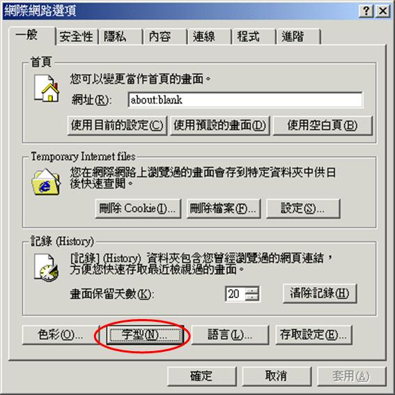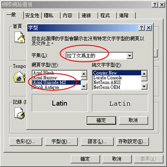 1. 包含:逐字查詢,凡輸入之檢索字串與資料內任何一個字有相符合者。 2. 開始:起始資料查詢,凡輸入之檢索字串與資料的開頭相符合者。 3. 結尾:結尾資料查詢,凡輸入之檢索字串與資料的結尾相符合者。 4. 等於:搜尋與輸入之字串「完全相同」的資料。 各欄位間提供「AND」、「OR」的布林邏輯運算功能。AND,表檢索結果必須符合不同欄位所輸入的檢索字串;OR,表檢索結果只要符合其中一欄位所輸入的檢索字串。 於欄位中輸入檢索字串,再點選「開始檢索」即可進行查尋。每次檢索時可選定每頁顯示的筆數,有「20」、「50」、「100」筆三種,可由下拉式選單選取。若輸入之檢索字串有誤,或欲重新輸入,可點選「清除」,即可將已輸入之檢索字串清除。 另外,為了方便讀者檢索巴利文經名,特別於檢索畫面中列出巴利文字母大小寫各十個,使用者只要移動滑鼠至所要檢索的巴利文字母上按一下滑鼠左鍵即可。 如果想要能正確在IE瀏覽器顯示巴利文字形,則必須先做設定: 1. 需先下載並安裝Unicode字型檔「Arial Unicode MS」。本資料庫為方便使用者,於「輔助檢索說明」中有提供下載Unicode字型檔。 2. 在IE設定:打開IE瀏覽器,在功能列上選擇「工具à網際網路選項à一般à字型(按鈕)」。(見圖三) 開啟「字型」對話框後,在「字集」的下拉式選單中選擇「拉丁文為主的」,於「網頁字型」的部分選擇「Arial Unicode MS」。(見圖四) 圖三、IE瀏覽器字型設定