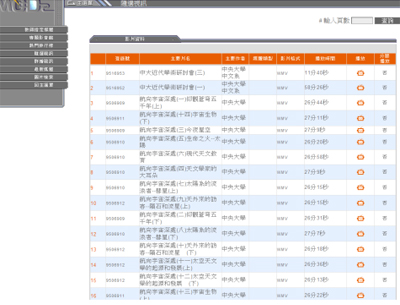 (三)使用者端系統 使用者需要使用相應的終端設備才能收看MOD隨選視訊。例如在有線電視的MOD系統中,使用者需要電視機和機上盒(Set Top Box)(註3)或視訊轉換盒將影像轉到電視上。但對圖書館及校園內而言,則以電腦或工作站作為使用者的終端設備。用戶的終端系統中,除了涉及相應的硬體設備,還需要配備相關的軟體。例如相關的圖形使用者介面(Graphical User Interface, GUI)也是十分重要。 因為視訊媒體資料具資料量大與時間上即時性的特質,因此從儲存系統讀取資料開始,經過資料的轉換(例如解壓縮),透過高速網路傳播,到遠端使用者放映,都必須密切配合以達到大量和即時的要求。故終端使用者人機操作介面系統必須含有下列三子系統:影片查詢子系統、網路介面子系統、即時解壓縮子系統。影片查詢子系統是一套超媒體系統,利用圖形介面供客戶選擇所要的影片及影音資料;網路介面子系統負責利用所提供的網路來向視訊伺服器提出要求,然後可取得壓縮影片及影音資料;即時解壓縮子系統負責解壓縮影片,利用MPEG軟體介面來控制或使用一般現成的MPEG解壓縮卡。 參、國立中央大學建置MOD系統過程 臺灣聯合大學系統四校多媒體隨選系統之建置計畫源起於民國93年3月11日的「臺灣聯合大學系統」(國立中央大學、國立交通大學、國立清華大學、國立陽明大學)圖書資源共享規劃小組第六次會議中正式提出,分成三期來進行系統電腦硬體設備、軟體及數位視聽資料、採購及建置(國立陽明大學的採購屬於未來的擴充購置)。整合音訊、視訊、光碟等各類型資料,提昇四校圖書館影音多媒體服務。四校圖書館並期望藉由本案之進行,將四校原有之影音多媒體及課程教學錄影資料加以整合,以支援四校網路教學、網路學習及研究,提供師生不受時間、空間限制之學習及研究環境,並促成四校圖書館影音多媒體資料之共享。國立中央大學MOD系統經由視聽資料組網站點選進入如圖1、2、3、4、5、6。 圖1:國立中央大學視聽資料組(http://mod.ncu.edu.tw/) ![]() 圖2:國立中央大學MOD系統 ![]() 圖3:國立中央大學MOD系統專題影音館(共29館) ![]() 圖4:國立中央大學MOD系統館藏(截至2006年3月27日共1,231筆) ![]() 圖5:國立中央大學MOD系統群播視訊 ![]() 圖6:國立中央大學MOD系統現場Live直播 ![]() 以下簡介中央大學經由臺灣聯合大學系統圖書資源共享計畫建置多媒體隨選服務的建置過程包括:注意事項與評估、系統功能規劃、技術規範、網路規劃建置、伺服器和儲存系統建置、環境整備、測試與系統後續修改、數位學習(e-learning)、以及數位化特藏發展。 一、注意事項與評估 臺灣聯合大學系統四校圖書館之視聽媒體及數位化館藏,目前由於分散典藏在各個不同學校的視聽中心,而各校視聽中心在有限的典藏空間下,都希望能朝多功能VOD個人欣賞區座位的空間規劃,將視聽媒體數位化或直接購置 MOD的相關教學影片,希望透過本計畫建置「四校視聽媒體數位化館藏──MOD隨選視訊系統」,並透過四校合作館藏的項目來共同購置相關的視聽媒體數位化館藏,使四校的師生能透過單一整合的介面與檢索方式,查詢到四校圖書館相關的視聽媒體數位化館藏的資源並觀賞到相關輔助教學的視聽資料,對提升讀者收集有關教學或研究方面之視聽資料的效率和品質,具有相當程度之幫助與貢獻。 系統主要功能特色如下: