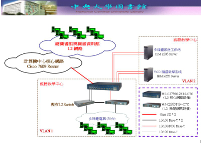 系統建置完成後,不但可以整合四校的視聽館藏資源,提供四校師生有效利用視聽資料作為輔助教學及研究之工具,並透過MOD隨選系統的整合查詢介面及管理系統的服務,可提高各校視聽數位館藏的使用率,對視聽館藏的推廣業務與服務品質,具有相當的貢獻。 在規劃中,必須再經由四校視聽相關之業務人員共同討論及規劃,首先進行MOD系統相關服務廠商的評估以及基本的電腦軟、硬體設備的採購作業,且需進一步規劃其共同使用的介面和管理系統,以及四校相關數位視聽媒體的採購及原視聽館藏數位化與編輯等分工問題,仍需作審慎的規劃與評估,才能達成其預期的績效。 國立中央大學的臺聯大MOD系統共分三期建置,第一期(92年12月1日-93年11月30日,屬「臺灣聯合大學系統」九十二年第二期計畫)購置多媒體隨選系統軟體、伺服器端授權及使用者端授權、多媒體隨選系統伺服器、磁碟儲存設備、網路施工及交換器等;第二期(93年05月14日-94年05月13日,屬「臺灣聯合大學系統」九十三年第一期計畫)購置MOD系統派送主機、MOD系統主機所需不斷電系統、機房安裝空調系統、安全監視系統升級、多媒體編輯工作站、多媒體隨選系統使用者端硬體、安全防盜鐵捲門及電動馬達、A0規格彩色噴墨繪圖印表機、網路施工、液晶螢幕機上盒、MOD視聽環境整修等;第三期(93年10月01日-94年09月30日,屬「臺灣聯合大學系統」九十三年第二期計畫)接續第二期,購置使用者端硬體設備、支援視訊群播用途網路攝影機、支援學習平台用途筆記型電腦、MOD展示用液晶電視機、MOD視聽環境裝修工程等。 二、系統功能規劃 多媒體隨選系統主要功能如下: 1. 支援多種查詢方法的資料搜尋機制 如影片類別、作者檢索、檔案格式、播放時間、片名長度、片名檢索、簡介檢索等。便利使用者迅速搜尋到符合需求的影片。 2. 整合視訊 如MPEG-1、MPEG-2、ASF、RM、MP3、WMV等。 3. 整合各項輔助教學系統機制 結合線上互動學習、數位學習等機制,形成動態並具積極性與互動性的教學研究服務。 4. 設定影片分級制度(可依各學院、各系所、使用者身分做區別) 能設定每個群組使用之人員及每個帳號使用影片權限,更可依使用者身顯示其權限可觀看欣賞之多媒體數位資源。 5. 相容各網路協定 如HTTP、TCP、UPD及支援多種形式的網路連接方式(ATM、ADSL、CABLE MODEL、Gigabit Ethernet)。 而在「臺灣聯合大學四校多媒體隨選系統」的招標規範及需求規格書內容逐項討論決議:另增修重點包含如下: 1. 壓力測試環境:至少須符合擬購買的軟體授權套數(每校圖書館視聽中心各50套和每校校園網路及網際網路各50套,可同時播放不同節目)。考量100個使用者同時上線,是否會造成系統當機,或無法播放影片的問題。 2. 多媒體影音資料數位化或轉檔作業:總共2000小時之影音資料,驗收前完成200小時之影音資料。 三、技術規範 MOD的技術規範介紹,主要為串流及RTP,串流技術已於前節介紹,不再贅述,RTP簡介如下: RTP(Real-time Transfer Protocol): 為處理具有即時特性的資料而訂定,一個屬於應用層的端對端(End-to-End)傳輸通訊協定,主要分為兩大部分:RTP及RTCP(RTP Control Protocol)。其中RTP 負責Data的傳輸,而RTCP則負責對該RTP session的參與者提供傳輸品質等相關的資訊,以達到部分的服務品質(QoS)的控制。RTP的連線埠號(Port)必須為偶數號碼,而RTCP的連線埠號必須為該偶數號碼的下一個數字。RTP/RTCP 並不提供服務品質或傳輸可靠性的保證,只提供時間戳記(Timestamp,用來達成同步等能力)、序號(Sequence Number,用來決定封包是否遺失的資訊)等一些具有即時特性資料的基本功能。因此RTP 必需要其他的輔助性資訊來完成串流媒體的實作,例如:RTP 封包負載資料(Payload)的格式等。 四、網路規劃建置 建置MOD系統需要高速的網路頻寬供影片串流下載收視。即是隨選視訊系統需採用Gigabit光纖連接計算機中心。直接布置光纖通道與計算機中心連線,提升網路層級,大大加速提升網路連線速度,也省去中間ROUTER及 SWITCH的防火牆及管理等。 圖7:國立中央大學MOD網路架構 ![]() 再者是網路速度原為10/100升級至100/1000的傳輸品質,配合校園Giga網路建置情形。根據系統廠商建議如下:網路核心設備有路由器(Router)CISCO 3750 1台;CISCO 2950T交換器 Switch 2台:共48個port;並從使用者端設置CAT6網路線,共50條CAT 6(傳輸速率100/1000)網路線,規劃網路架構圖如圖7。 在主機方面則選用中階伺服器(IBM eServer xSeries 235)安裝系統,該伺服器支持雙Xeon CPU,前端匯流排頻率為533MHz,記憶體最大可達12GB,記憶體型號為ECC DDR266,該服務器內置Broadcom NET-XTREME 千兆乙太網接口,LSI Logic 53c1030 Ultra320 SCSI RAID控制器,以及64位元133MHz PCI-X擴展槽。該伺服器提供很大的頻寬供運算,例如一般金融規模、數字演算、地震分析等的應用場合。另外更增置4GB的記憶體,提高了伺服器運算速度。 選用的作業系統為Windows 2003 Server Enterprise Edition,Windows 2003 Server(NTFS)的數據傳輸量高於SuSE Linux(XFS)。這主要是Windows使用的非同步程序在Xeon的系統中發揮了作用。另外在file I/O處理上,Windows環境下的性能更優於SuSE Linux(XFS),原因歸功于Windows在進行file I/O的工作,不同於Linux系統的限制請求的做法,Windows能夠回應所有的請求,之後進行非同步地等待所請求數據的送回。在Windows 2003中,少於8ms內,Windows可以處理更多的I/O次數。對於8ms的反應時間,Windo