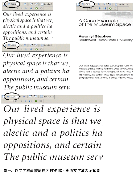 2. 雜誌書籍 以臺灣大學雜誌數位化為例,雖然最終目標是產出PDF格式之檔案,將之載入資料庫系統中,以提供使用,但是因為是以高規格數位相機(數位相機的CMOS或CCD在1100萬像素以上的等級)進行數位化,所以在產出PDF檔的過程中,其實亦保留或轉檔出以下格式之檔案,並分述理由如下: (1) DNG Archive File (RAW) 該種格式的檔案本身,以少量的空間保留了最完整的影像內容資訊,只要經由相關軟體,即可依設定而轉檔出Tiff格式、Jpeg格式等不同類型、不同解析度之檔案,對原始影像的完整資訊之保存、儲存空間的節約等,都較為有利;唯需要對轉檔用的軟體有所了解,才能順利轉檔。 (2) 24 bit彩色Jpeg (optional) 有的雜誌本身含有一些彩色頁,轉出彩色的Jpeg檔,可以在必要提供彩色頁時使用。 (3) 8 bit灰階Tiff (optional) 如欲節省儲存空間,不需彩色頁,但需要以照片的灰階效果呈現雜誌中的照片,則可以只轉出灰階之檔案。 (4) 黑白Tiff 為轉置黑白的PDF檔之前置歷程,因檔案並不大,所以可以考慮保留。 (5) PDF 為資料庫系統中所將使用的檔案格式。經轉為PDF格式之檔案後,再進行同一文各頁之串檔,串成一文多頁。而臺灣大學圖書館近期進行數位化的雜誌,大多數只有封面是彩色,其餘為黑白之刊物。因考量保留封面的豐富彩色資訊,以及黑白格式可以使檔案降至最小,乃決定只當含彩色印刷時(主要是封面與封底的部分)才取用彩色頁,其餘都取用黑白格式,進行串檔。串檔之容易與否,與拍攝之時的檔案命名極為相關,詳見下文三之(四)。 如果產出PDF檔的方式是以一般的掃描機直接設定為PDF檔,而且是一文多頁的模式進行掃描,則大多在一次設定後,即產出所設定的一種格式之檔案,能夠彈性運用的可能性較小,也無法保留影像內容資訊最完整之原始檔案。 串連一文多頁的途徑,尚可利用J-Tiff格式或Jpeg格式之檔案。但是,以此二種格式之檔案進行串連一文多頁,會使最終檔案極大,而不利傳輸,因此,需考慮配合使用壓縮圖檔軟體。唯此種情形,使用者端亦必須下載開啟該種壓縮圖檔之軟體,才能開啟影像圖檔。相較之下,仍以網路上較為通用的Adobe Acrobat Reader即可開啟的PDF格式之檔案,通用性與便利性較高。 至於近幾年來新產出的電子文件,如果希望將之以PDF檔案格式在網路上提供使用,則將已排版好的電子檔直接轉存為PDF檔,可以獲致不錯的效果;尤其如搭配Adobe的CS2軟體進行轉檔壓縮,將可使檔案壓縮至極小,卻可使字體影像達到最佳效果,例如,一篇21頁之PDF格式之檔案,檔案大小僅165KB,但放大倍率可以極高,仍無損解析度,如〔圖一〕。