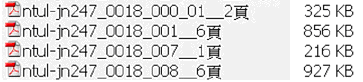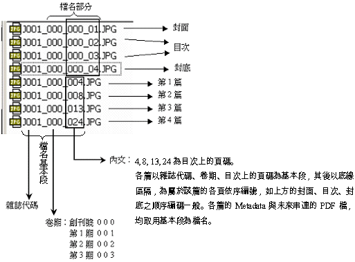 (二)全文 1. 文件型或單件文物 年代較久遠的珍貴文件型資料,其原文大多為書寫文字或者版刻印刷之文字。此二類型之文字,均無法透過OCR的方式,進行全文之數位化。因此,如需進行全文建檔,一般均必須透過人工逐字輸入。 2. 雜誌書籍 雜誌書籍全文之數位化,其主要功能之一是在資料庫的後端支援全文檢索,否則提供影像檔,即足以滿足使用者閱覽的需求。要將雜誌書籍的內文進行文字輸入之數位化,經測試結果,以光筆逐行閱讀,或整頁一次進行OCR辨識轉換,都只有當印刷字體極為清晰,頁面為純白、完全無底色,而且版面單純無特殊排版或頁首、頁尾、頁框邊緣文字的情形,才可獲致理想的結果。而雜誌書籍實際的情形是,往往含有各種版面的設計、頁首頁尾文字、大小或粗體文字混雜、套印底色的情形,因此使OCR的效果大打折扣;所需校對的功夫人力,難以為計。因此,只有近年來以電子檔產出的文件,應用原來的文字電子檔的部分,比較易行。而因為印刷類的雜誌書籍,文字在閱讀上不會有難辨識之問題,因此除非有特殊目的,否則全文數位化並非必要。 (三)Metadata 1. 文件型或單件文物 數位化的對象資料如果是文件型或是單件的文物,則其Metadata大多是以「件」為單位;大多數情形是一筆Metadata對應一個數位物件。古文書與手稿資料則亦有一筆Metadata對應多個影幅之情形,但是,基本狀況是針對「件」為單位建置Metadata。然而各筆Metadata的內容,同一欄位的資訊相異度高,不易共用欄位內的資訊。 2. 雜誌書籍 數位化的資料對象如果是雜誌書籍,則建置Metadata可能是以雜誌中的「篇」、書冊中的「章節」為單位。而同一本雜誌及同一本書籍中的各筆Metadata,其可以共用欄位資訊的欄位較多,例如,書刊名、出版社、出版年、書籍的作者或編者、雜誌的卷期、雜誌的專欄名稱等;換言之,針對同一本雜誌或書籍建置Metadata時,各筆Metadata資料中,真正不同而需個別鍵入資料的,只有篇(章節)名、作者、頁碼等少數欄位而已。因此,在規劃設計建檔軟體時,可以考量如何充分利用到可共用的欄位,以提高建檔效率。 (四)檔案命名 任何型式的資料之數位化,在進行相關規劃之初,即必須考量如何使數位影像、數位全文、詮釋資料(Metadata)等各類資料能夠在最少人工的情況下,順利互相關聯。臺灣大學圖書館進行各種類型資料之數位化計畫,主要都是透過檔名的規劃,使未來資料庫系統中的Metadata能夠順利連結到相對應的數位影像檔與全文檔。檔名規劃的基本原則是使影像數位檔、全文數位檔、Metadata編號等各類數位檔案之主檔名一致,只有副檔名不同(Metadata編號只有基本檔號,無副檔名): 1. 文件型或單件文物 以資料原有的編號作為基本段,同一文件如因包含附件、浮貼、文件過大而分區數位化,因此產出多影幅,則這些隸屬於同一文件的所有影幅,都是在同一基本段之下作檔名的延伸,進行檔案的命名存檔。如此則不論是程式或人工,都可辨識屬於同一文件的所有影幅。 2. 雜誌書籍 雜誌書籍之數位化,因為也需數位化其封面、封底、目次,又希望未來以自動排序整理數位檔案時,各雜誌之封面、目次、內文的各篇能夠依序排列。因此,臺灣大學圖書館將雜誌進行數位化時,單篇全文影像之存檔檔名及串連一文多頁的PDF檔之存檔檔名如〔圖二〕之圖示說明:串連一文多頁時,以及為各筆Metadata編號時,均根據目次各篇起始頁碼作為檔名的尾數,如此則兩方面的工作成果即可容易地互相關連。