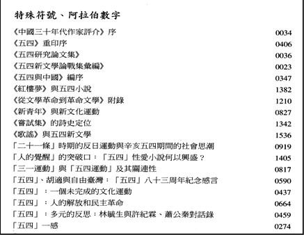 二、題名索引 (一)特殊符號排列法的缺失(見圖一) 編論文目錄,正文按分類排列者居多,為方便讀者從不同角度檢索資料,正文前備有分類總表和詳表,正文後有各種輔助索引,其中最流行的是作者索引、題名索引、標題索引。有獨立排列的,也有混合排列的。作者索引多按中文、西文(包括英文字母、拉丁字母、希臘字母)、日文、韓文排列。中文習慣以筆畫多寡排列,少數按照四角號碼和部首排列;中國大陸則改用漢語拼音排列。題名索引除上列幾種排列法外,如遇到開頭是阿拉伯數字的,也有集中排列的。這幾種編法或檢索方法,編者和讀者(用戶)已習以為常,成為慣例。 圖一:特殊符號排列法 ![]() 《五四目錄》的題名索引,除保留傳統的漢字筆畫、英文字母和阿拉伯數字排列法外,另創特殊符號排列法。這似乎是中文索引史上的創舉。所謂特殊符號包括兩組,一組依序是《》、〈〉、[ ]、「」等;另一組依序是:,、(本身亦未統一,也有依、:排序的)。其方法是把145筆題名開頭有第一組符號者集中排列,照第一組順序排列,符號相同,再照漢字筆畫排列。如第1筆為: 《中國三十年代作家評介》序。第6筆為: