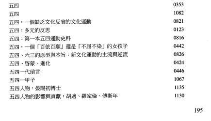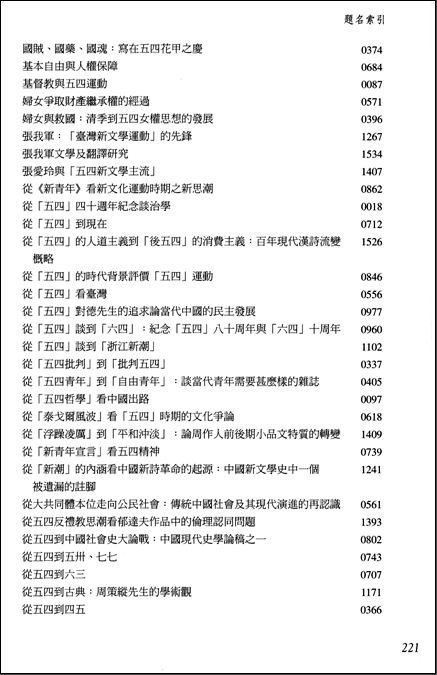 六、收錄標準不一的漏收:資料彙編部分 唐山出版社於2000年出版一套資料彙編,書名《現代中國自由主義資料選編──紀念「五四」八十周年》,主編者有張忠棟、李永熾、林正弘,編輯者有劉季倫、薛化元、潘光哲。內容是蒐集與整理「五四」以來中國自由主義思潮的資料,材料以期刊、文集為對象,如果是「取材於個人文集者,必儘可能索查原刊出處,相互覆校,力求呈現文獻的原始風貌」。全書分為9種10冊,這9種書名是:1. 什麼是自由主義?2. 「五四」與學生運動。3. 教育獨立與學術自由。4. 文化的道路。5. 科學精神與科學方法。6. 社會改革的思潮。7. 民主、憲政、法治(2冊)。8. 基本自由與人權保障。9. 自由經濟的主張。 這一套書,《五四目錄》收6種,未收1、6、9三種,未知編者標準何在?以第一種來說,自由主義是「五四」以降具有影響力的思潮主義,首冊書名標榜自由主義,是沒有理由不收錄的。再以第6種《社會改革的思潮》來說,其內容包括個人主義、婦女解放、家庭問題,以及社會的平等等,都是「五四」以來眾所關注的焦點話題,更應該收錄。第9種是在經濟的領域裡,主張自由經濟,反對統制經濟,思考經濟自由與社會平等的關聯,也應收錄。加上這一冊收錄全書9種10冊的總目錄和作者索引(還附有作者異名表),可供讀者檢索全書之用。 又,雖然《五四目錄》收錄第二種《「五四」與學生運動》,然書中40篇文章中有多篇涉及「五四」學生愛國運動,未能加以收錄,不無遺憾。 七、個人文集的漏收 編專題文獻目錄,文集(含個人文集、會議論文集、主題論文集)是僅次於期刊文獻的重要文獻源。《五四目錄》約收期刊論文770筆,約佔了《五四目錄》所收1,559筆的一半,其次,文集論文約450筆。筆者抽選身邊的韋政通和李澤厚的文集,核對《五四目錄》,發現均有遺漏的情事。《五四目錄》韋政通收5筆資料,序號分別為0317、0412、0639、0646、0832。筆者據韋政通《歷史轉捩點上的反思》(東大圖書公司,1989年)乙書,查出〈「五四」在今日的意義〉、〈民主:播種不易,收成尤難──念「五四」想今朝〉兩筆,是《五四目錄》漏收的。這兩筆均分別刊載於《中國論壇》1986年5月、1988年5月。 李澤厚的文章,《五四目錄》收了3筆,序號分別為0123、0441、0873。筆者據李澤厚《走我自己的路》(風雲時代出版公司,1990年)乙書,查出〈「五四」回眸七十年──香港答林道群問〉、〈啟蒙的走向──「五四」七十周年紀念會上發言提綱〉兩筆,是《五四目錄》漏收的。同書〈關於中國傳統與現代化的討論〉乙文,也是討論「五四」的文章,也可收錄。 其他,像自稱「五四之子」的殷海光,常利用每年的五月份,發表檢討五四運動的文章,《五四目錄》收9筆,漏收〈讓我們携手從事文化的創建──兼紀念五四〉乙文,此文收在陳鼓應編《春蠶吐絲:殷海光最後的話語》,此書1969年出版,世界文物供應社經銷,1978年增訂版,由遠景出版社印行。 據《五四目錄》作者索引,約收20筆左右的作者有林毓生、余英時、周策縱、周玉山、周陽山。他們的文集,很可能還會有《五四目錄》漏收的情形,礙於截稿時間已到,無法核對。 拾壹、輔文部分 一、作者索引 作者索引有的處理得很好,如正文出現的作者欄位,有寫「社論」、「編輯部」、「每週評論」等,這些並非作者,所以編作者索引時改題「大學雜誌社論」、「中華雜誌社論」、「政治評論社論」、「綜合月刊編輯部」、「中華雜誌每週評論」等,這是正確的做法。不過,仍有些缺失,如: