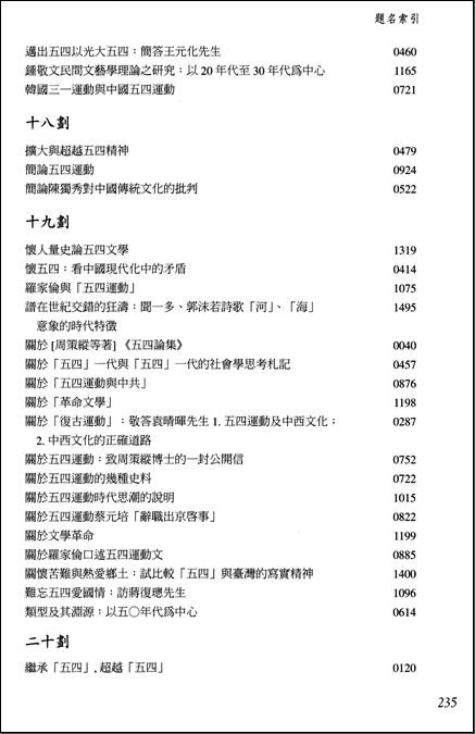 其他專書總頁數的錯誤,還有序號0526《從五四到河殤》,423頁誤為286頁。序號0815《五四運動在上海》,249頁誤為233頁。序號0866《五四運動史》,桂冠圖書公司,頁數423頁,此書在圖書館只看到上冊,372頁。另一本龍田出版社版《五四運動史》(序號0803),1980年,703頁。筆者手上有一本1981年1月修訂再版的,536頁。 玖、類目與分類的商榷 一、類目的商榷 類目的作用在於「揭示具有共同屬性的一組文獻即同類文獻」,類目有多種類型,常見的是按等級分為基本部類、基本大類(一級類目)、二級類目、三級類目等。(見《圖書館學百科全書》,中國大百科全書出版社,1993年,頁74-75)基本部類像經史子集,不能單獨列表;基本大類像美國的杜威十進分類法分為10大類,美國國會圖書館分類法分為20大類,國內的中國圖書分類法分為10大類,中國大陸的中國圖書館分類法分為22大類。基本大類可單獨列表,不必有二級類目。所以《五四目錄》只有11類,沒有二級類目。陳亦伶的書評,提到《五四目錄》的11個類目完全是依據國家圖書館的中華民國期刊論文索引資料庫的分類方式,按11類的類目(類名)有哲學、宗教、科學、技術、教育、社會、文化、禮俗、政治、經濟、外交、歷史、傳記、語言、文學、藝術等四十餘字,幾乎完全出現在《中國圖書分類法》、《中華民國期刊論文索引》的一、二級類目,難怪陳亦伶批評說「套用哪一種專科目錄皆可」適用。類目(類名)共有53字,未有書名中的「五四」或「五四運動」這幾個字,是欠妥的。林慶彰主編的《乾嘉學術研究論著目錄》,分4大類目,第二類目是「乾嘉學術通論」,第三類目是「乾嘉學者分論」。中國大陸寇淑慧編《二十世紀詩經研究文獻目錄》,分上下兩編,上編是「詩經通論」,類目都會有書名的影子。 陳亦伶更具體指出分類的類目要能看出與五四研究的關係,在校學生能有這種看法,極為難得、少見。接著又列舉3種類目,供編者參考,即:五四運動與國父思想、五四研究相關書評、五四時期的科學思潮。筆者也嘗試列舉十幾種類目供參考之用:五四綜論(總論)、五四事件的經過、五四學生愛國運動、五四與新文化運動、五四與新文學運動、五四與中國知識分子、五四思想解放運動、五四與民主法治、五四與啟蒙運動、五四的評價(含五四的回顧)、五四人物評論、傳統與反傳統、五四文獻史料及其他。 二、分類的商榷 圖書分類或論文分類,理論方面存在兩個問題,一是前文所談,要有合理的分類體系和分類表;二是歸類是否適當。歸類就是內容性質相同的圖書論文分類在一起。《五四目錄》有部分題名內容與性質完全相同,甚至是連作者與題名都是一樣的,卻未能歸類在一起,有的還歸入不同的大類(指11類)。陳亦伶〈《五四運動論著目錄初稿》評介〉乙文,亦指出序號0322條「五四的歷史教訓」置於「社會與文化」類,但類似條目亦置於「歷史與外交」類。本文另提出11條有待商榷的例子,敬請讀者指教。