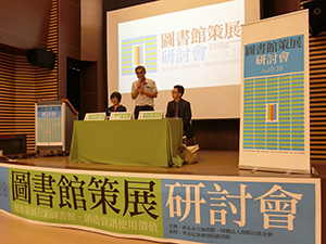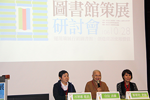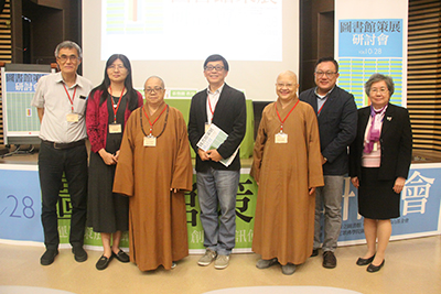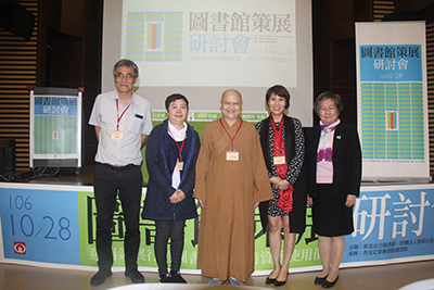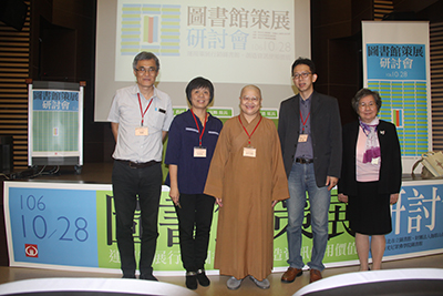 ▲【第三場研討】圖書館策展實務分享:(左起)高鵬館長、 呂智惠組長、自衍法師、葉翠玲老師、黃鴻珠教授 |