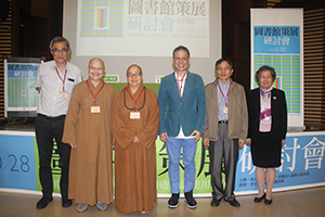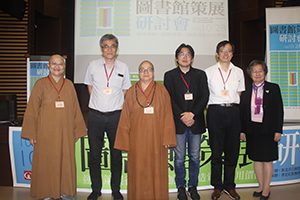▲【第二場研討】圖書館策展實務分享:(左起)高鵬館長、 阮明淑教授、自衍法師、黃文德組長、黃鴻珠教授 |