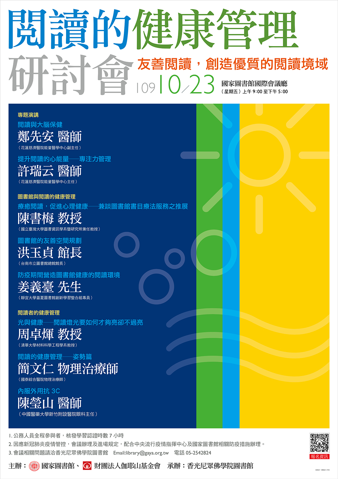 | 會議議題: | 1. 推廣正確的健康閱讀概念 2. 學習大腦保健與提升閱讀的心能量 3. 認識閱讀的視力、姿勢、環境等健康管理 4. 紙本與數位媒介的健康閱讀 |
