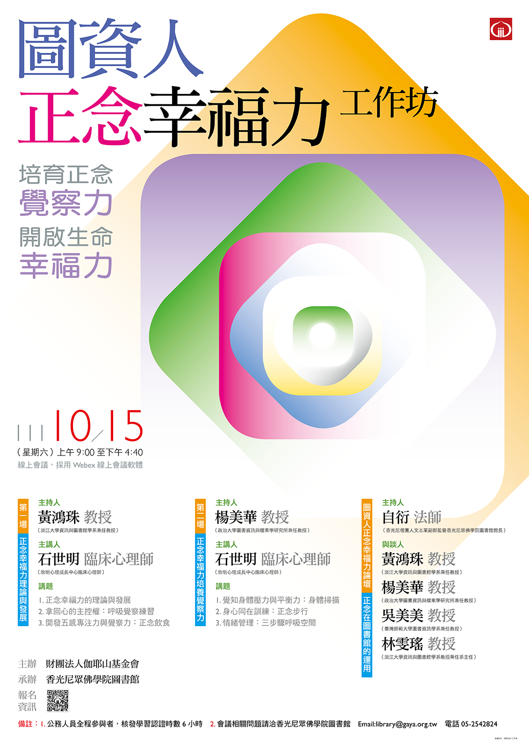 | 備註: | 1. 本研討會可以登錄公務人員學習時數6小時 2. 會議相關問題請洽香光尼眾佛學院圖書館: Email:library@gaya.org.tw,電話05-2542824 |